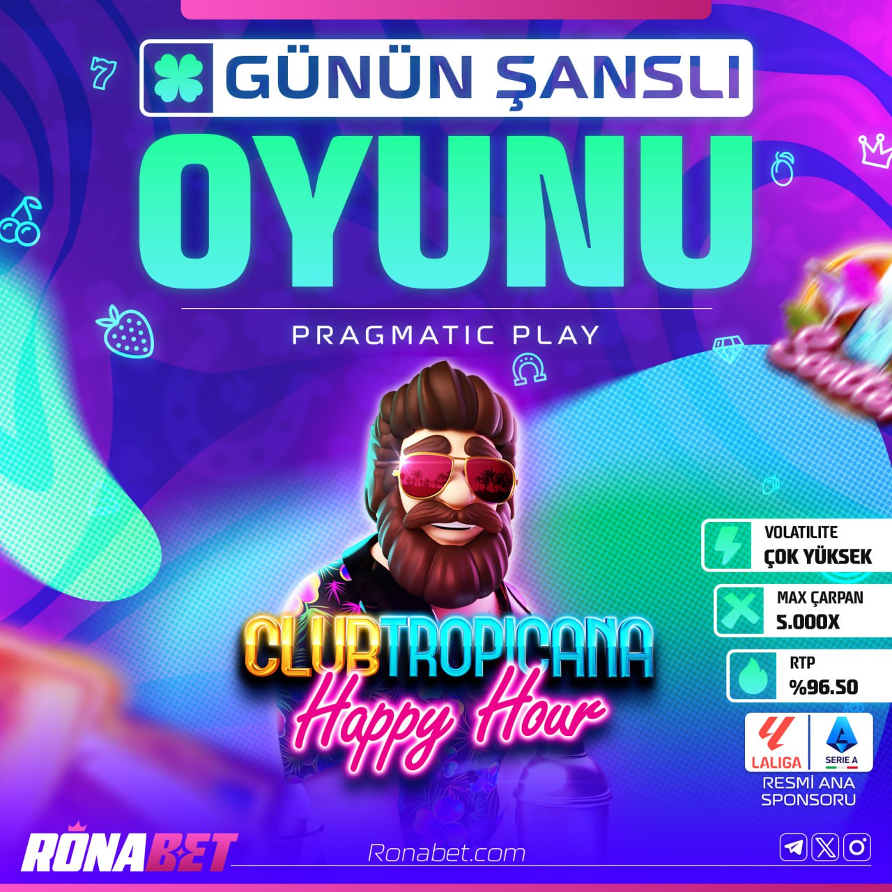 Sıcak kumlar, tropikal içecekler ve keyif dolu müzikler… Pragmatic Play’in eğlenceli slot oyunu Club Tropicana: Happy Hour, bugün Ronabet’te yaz ruhunu yaşatıyor! 🏝️